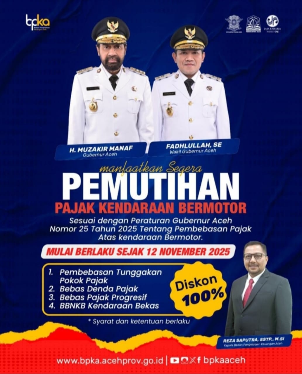 “Mulai 12 November sampai 31 Desember, masyarakat yang pajak kendaraannya mati dapat mengaktifkannya kembali tanpa denda. Cukup bayar pajak pokok dan asuransi tahun berjalan,” kata Reza di Banda Aceh, Selasa (11/11/2025).