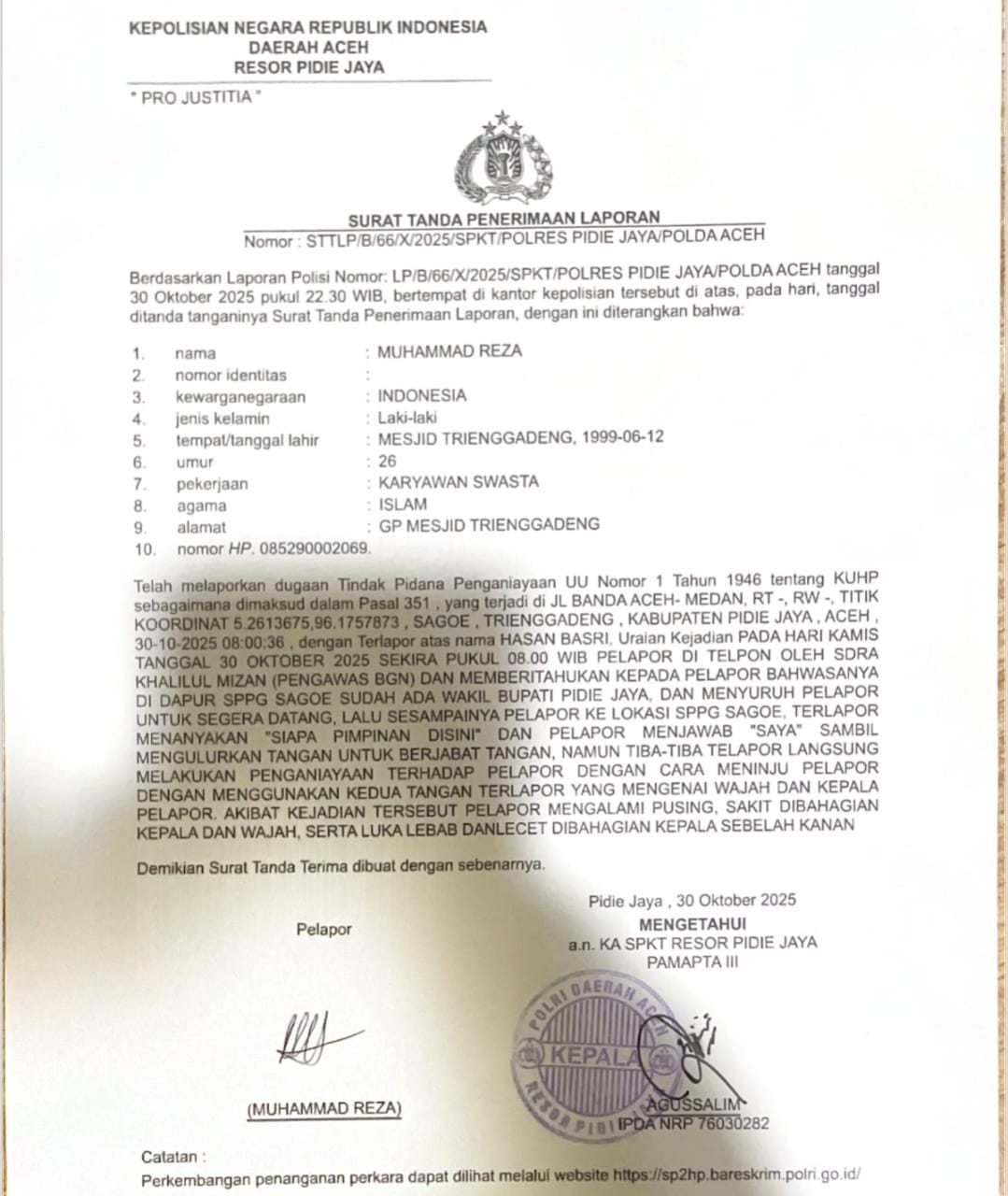 Dugaan penganiayaan tersebut kini telah resmi dilaporkan ke Polres Pidie Jaya dengan nomor STTLP/B/66/X/2025/SPKT/POLRES PIDIE JAYA/POLDA ACEH.