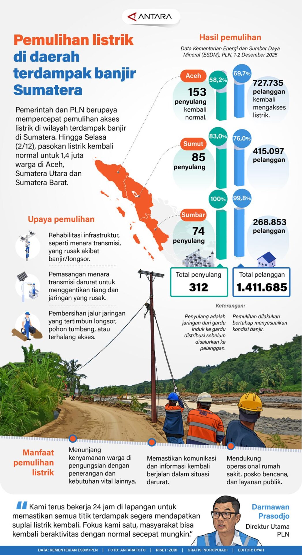Hingga Selasa (2/12), pasokan listrik berhasil dinormalkan kembali untuk sekitar 1,4 juta warga di Aceh, Sumatera Utara, dan Sumatera Barat, setelah infrastruktur utama yang rusak—mulai dari tiang, gardu, hingga jalur transmisi—berangsur dipulihkan.[]
