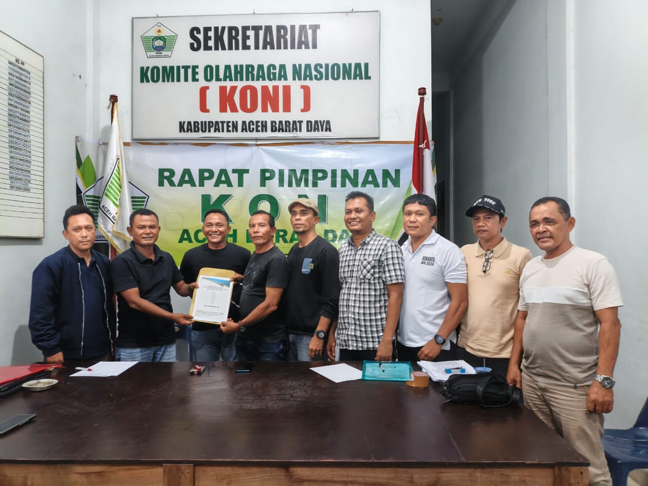 Berkas pendaftaran diterima langsung oleh anggota tim penjaringan dan Penyaringan Calon Ketua Umum KONI Abdya, Jiwa Sagara, bersama SM Rizka Nazarullah, Helmi, dan Wisman.