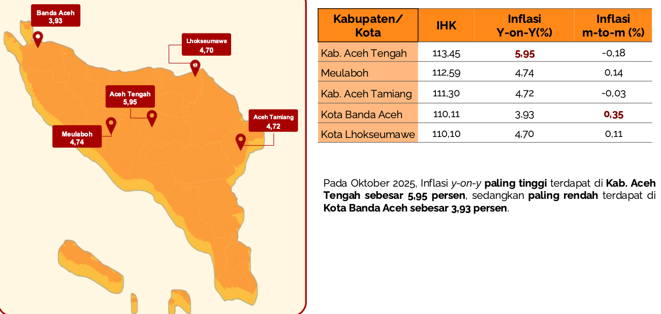 , Banda Aceh – Badan Pusat Statistik (BPS) Provinsi Aceh mencatat, Kabupaten Aceh Tengah menjadi daerah dengan tingkat inflasi tahunan (year-on-year/y-on-y) tertinggi di Aceh, yakni mencapai 5,95 persen pada Oktober 2025. Sementara itu, Kota Banda Aceh justru mencatat inflasi terendah, yaitu 3,93 persen.