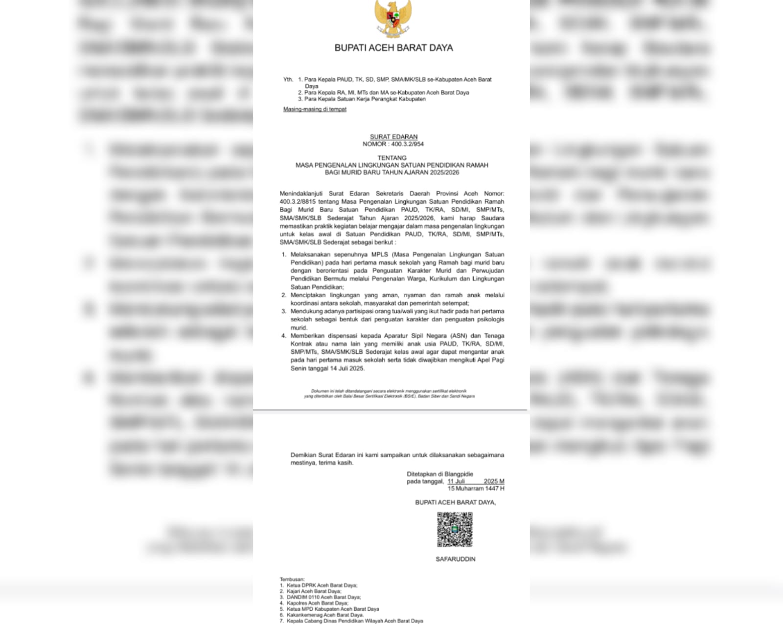 , Blangpidie – Bupati Aceh Barat Daya (Abdya), Safaruddin, menerbitkan Surat Edaran yang mewajibkan seluruh sekolah di wilayahnya melaksanakan hari pertama masuk sekolah dengan pendekatan yang ramah terhadap murid baru. Edaran ini diteken langsung oleh Bupati pada 11 Juli 2025 dan berlaku untuk tahun ajaran 2025/2026.