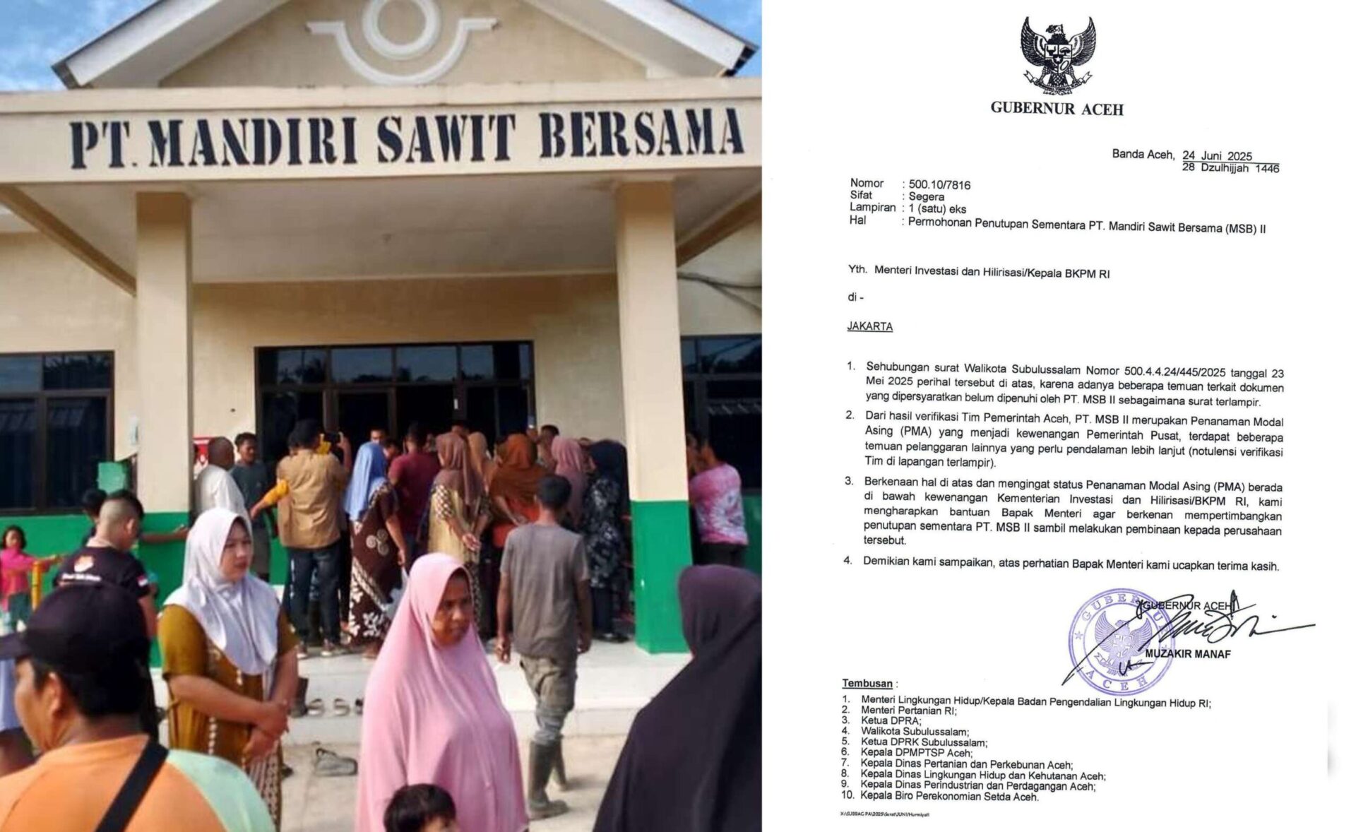 , Banda Aceh — Gubernur Aceh, Muzakir Manaf, secara resmi meminta Kementerian Investasi dan Hilirisasi/Badan Koordinasi Penanaman Modal (BKPM) untuk menutup sementara operasional PT Mandiri Sawit Bersama (MSB) II di Kota Subulussalam. Permintaan tersebut disampaikan melalui surat bersifat segera bernomor 500.10/7816 tertanggal Rabu, 16 Juli 2025.
