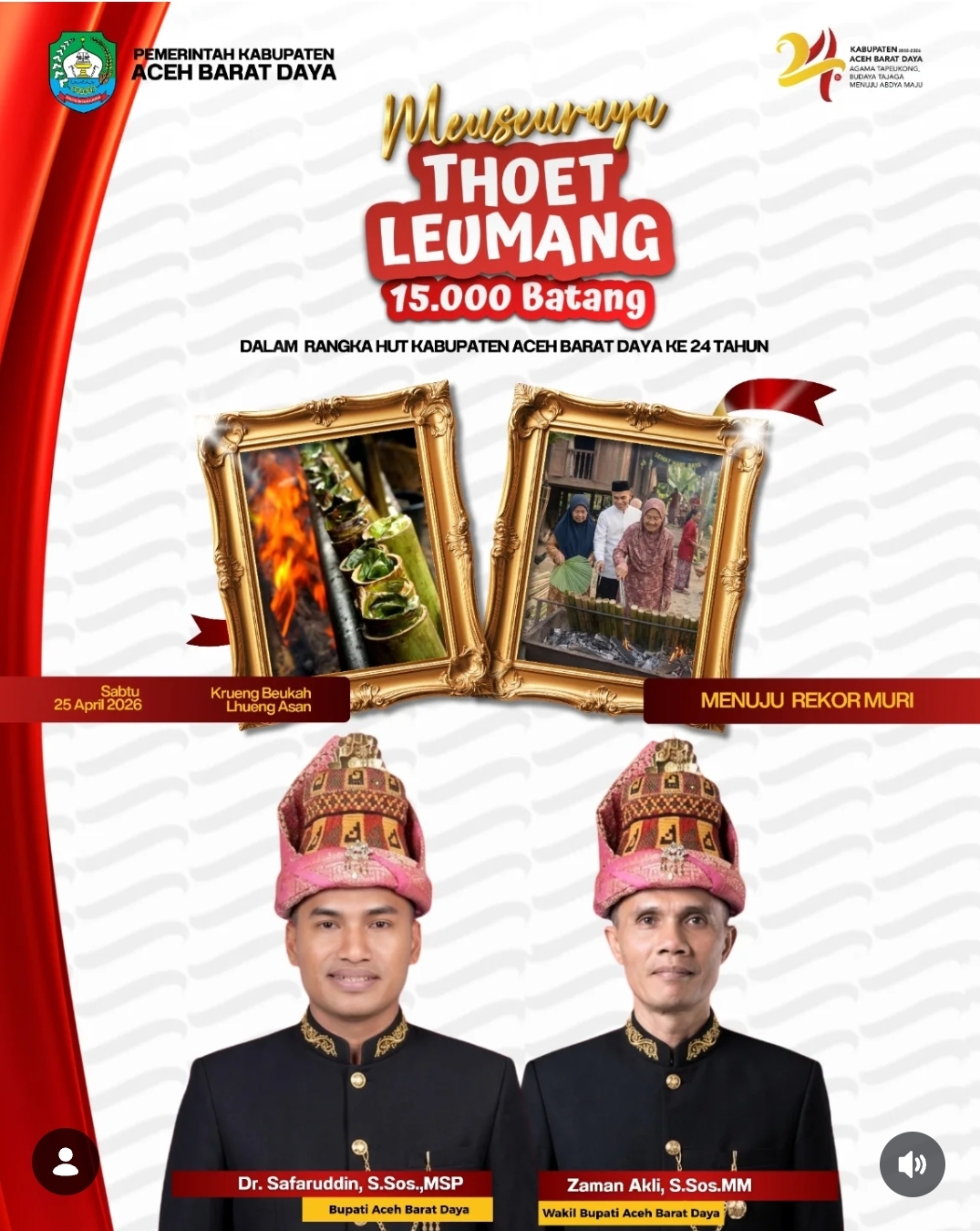 , Blangpidie — Kabupaten Aceh Barat Daya (Abdya) sukses mencetak sejarah baru dengan memecahkan rekor Museum Rekor Dunia Indonesia (MURI) melalui pembakaran 15 ribu batang lemang dalam perayaan Hari Ulang Tahun (HUT) ke-24, Sabtu (25/4/2026).