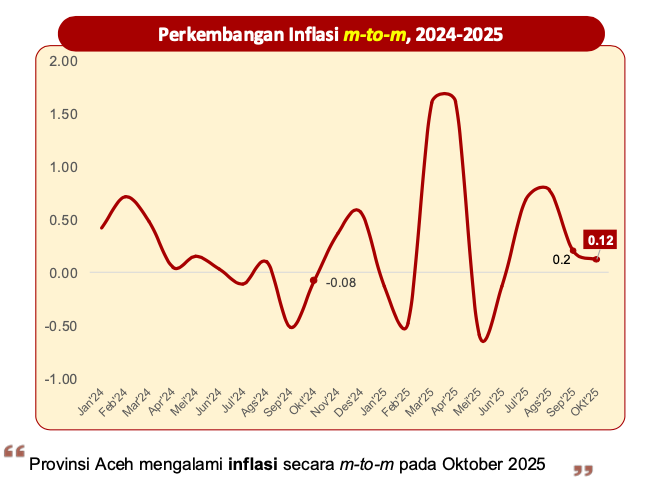 , Banda Aceh – Badan Pusat Statistik (BPS) Provinsi Aceh mencatat, inflasi di Aceh pada Oktober 2025 mengalami kenaikan sebesar 0,12 persen (month-to-month/m-to-m).