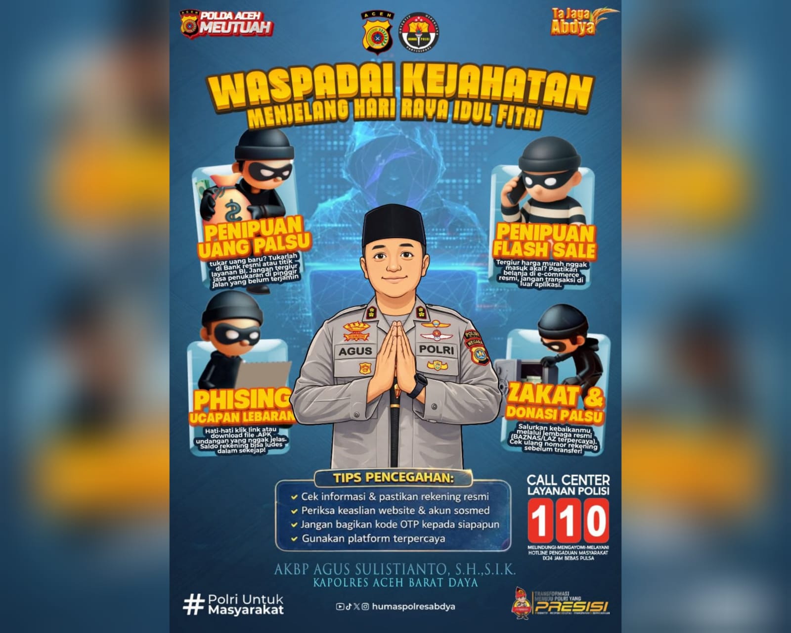 , Blangpidie – Kapolres Aceh Barat Daya (Abdya), AKBP Agus Sulistianto, mengimbau masyarakat meningkatkan kewaspadaan terhadap berbagai modus kejahatan menjelang Hari Raya Idul Fitri, terutama penipuan berbasis digital.