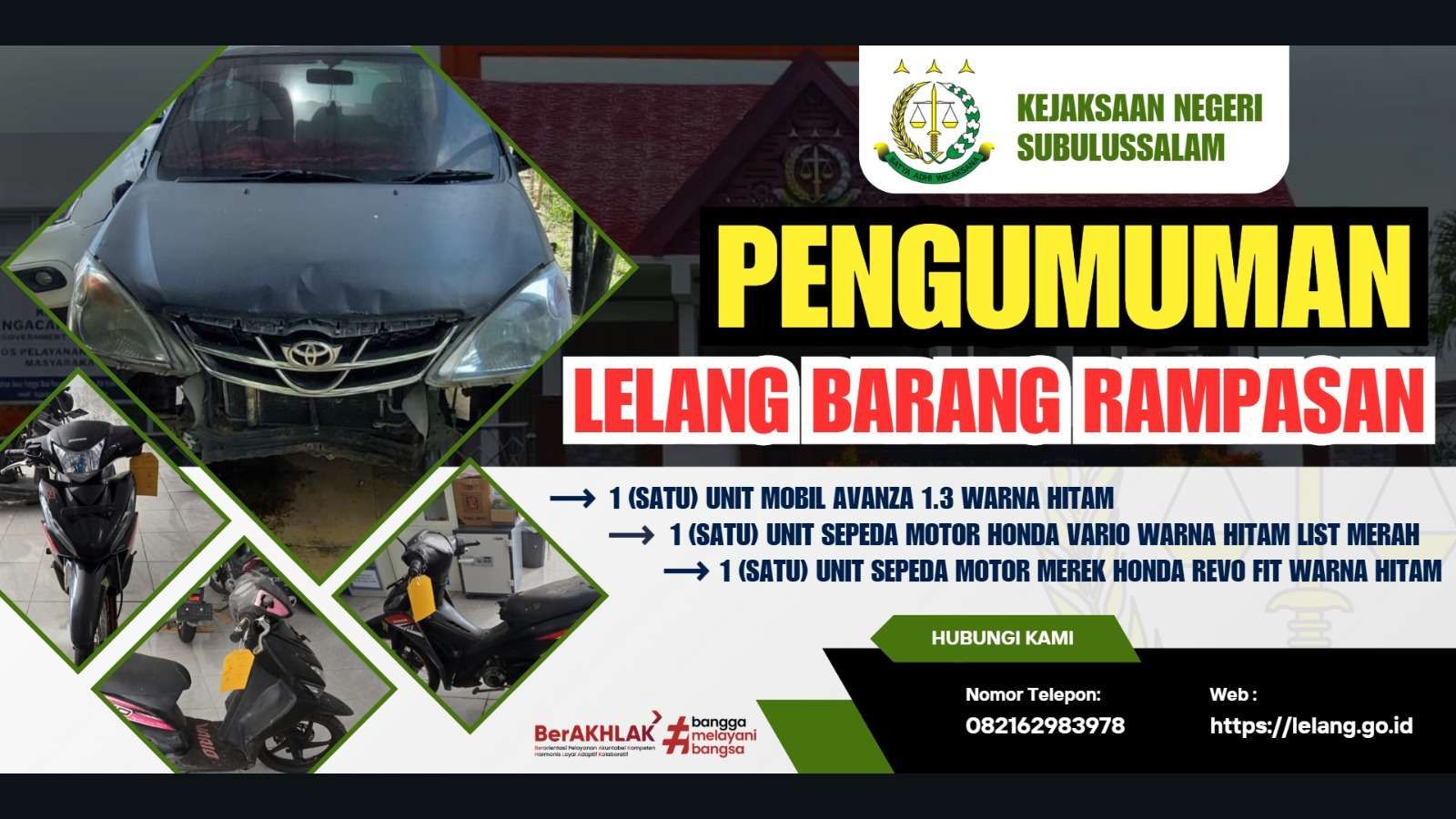 , Subulussalam – Kejaksaan Negeri (Kejari) Subulussalam akan menggelar lelang barang rampasan negara pada Kamis, 11 September 2025, pukul 14.00 WIB. Lelang dilakukan secara online melalui Kantor Pelayanan Kekayaan Negara dan Lelang (KPKNL) Banda Aceh dengan akses resmi di situs lelang.go.id.