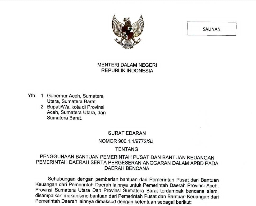 Surat edaran yang ditandatangani Mendagri pada Kamis (11/12/2025) itu ditujukan kepada seluruh kepala daerah di Provinsi Aceh, Sumatera Utara, dan Sumatera Barat yang saat ini tengah menangani dampak bencana hidrometeorologi.