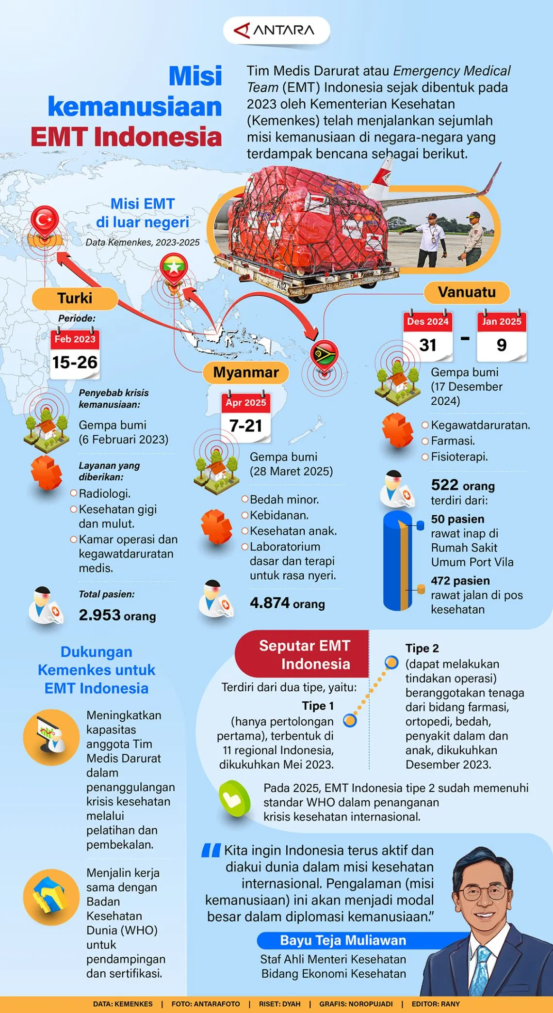 , Infografis – Tim Medis Darurat atau Emergency Medical Team (EMT) Indonesia, yang dibentuk pada tahun 2023 oleh Kementerian Kesehatan (Kemenkes), telah aktif menjalankan berbagai misi kemanusiaan di sejumlah negara terdampak bencana. Keberadaan EMT Indonesia ini menjadi bagian penting dalam respons cepat dan efektif terhadap situasi darurat, dengan memberikan bantuan medis yang dibutuhkan oleh korban bencana secara profesional dan terkoordinasi. Sejak pembentukannya, tim ini telah menunjukkan komitmen kuat dalam membantu pemulihan kesehatan masyarakat di wilayah-wilayah krisis, memperkuat solidaritas kemanusiaan Indonesia di kancah internasional.[]
