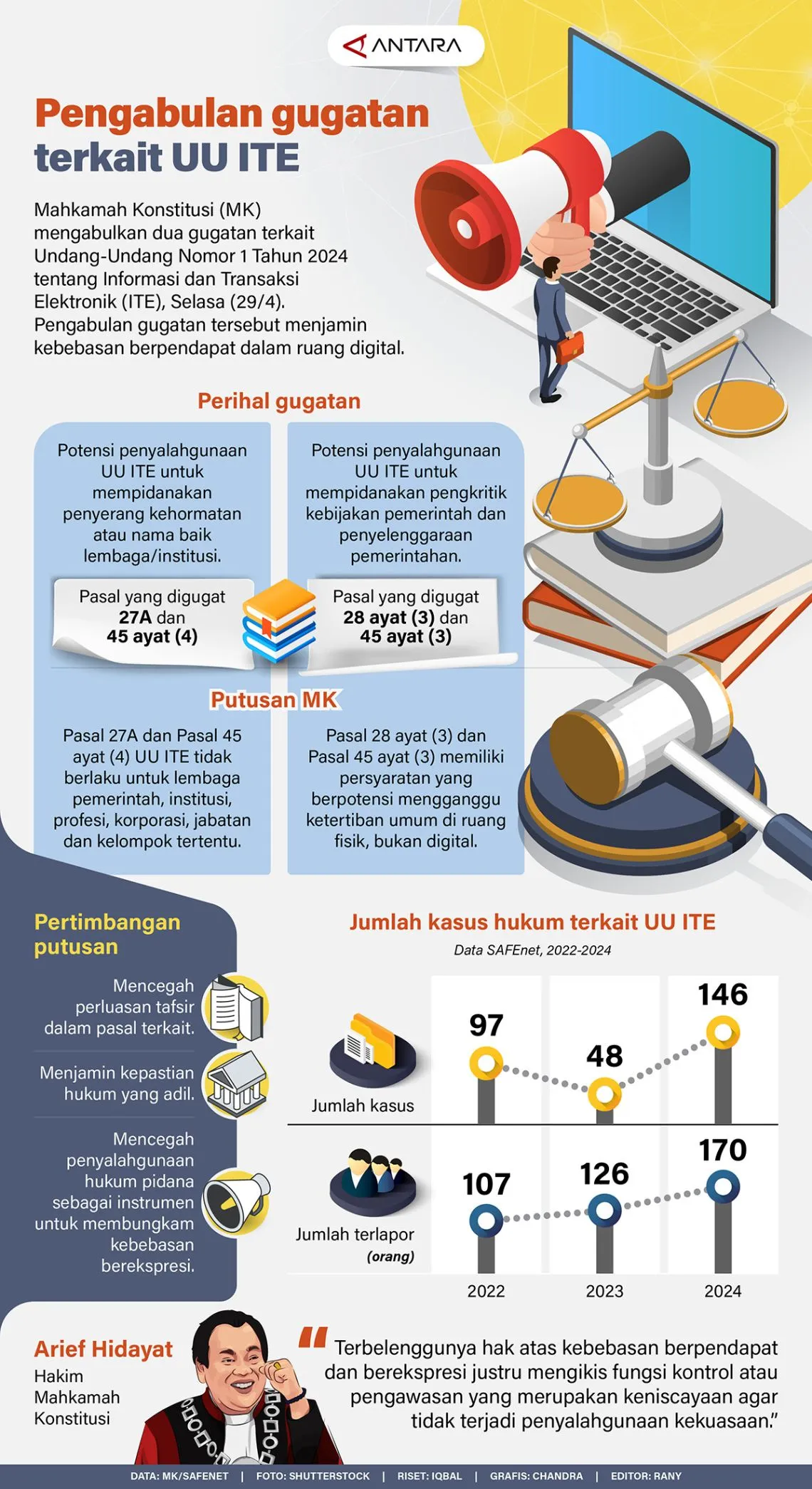 Mahkamah Konstitusi (MK) mengabulkan dua gugatan uji materi terhadap Undang-Undang Nomor 1 Tahun 2024 tentang Informasi dan Transaksi Elektronik (ITE), Selasa (29/4/2025). Putusan ini menjadi angin segar bagi demokrasi digital, karena memperkuat perlindungan terhadap kebebasan berekspresi dan berpendapat di ruang siber, sekaligus mengurangi potensi kriminalisasi atas konten-konten yang disampaikan masyarakat secara sah. (ANTARA)