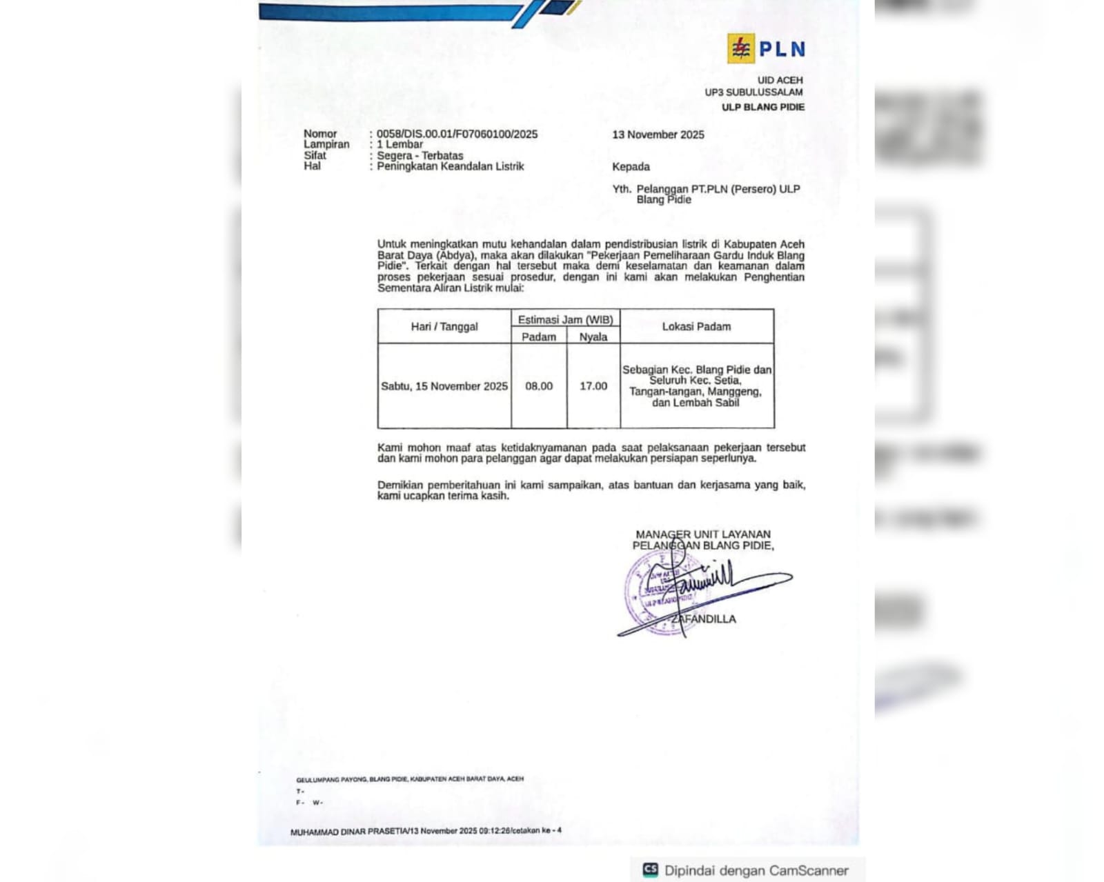 Berdasarkan surat resmi PLN bernomor 0058/DIS.00.01/F07060100/2025 yang diterbitkan pada 13 November 2025, pemadaman dijadwalkan berlangsung mulai pukul 08.00 WIB hingga 17.00 WIB.