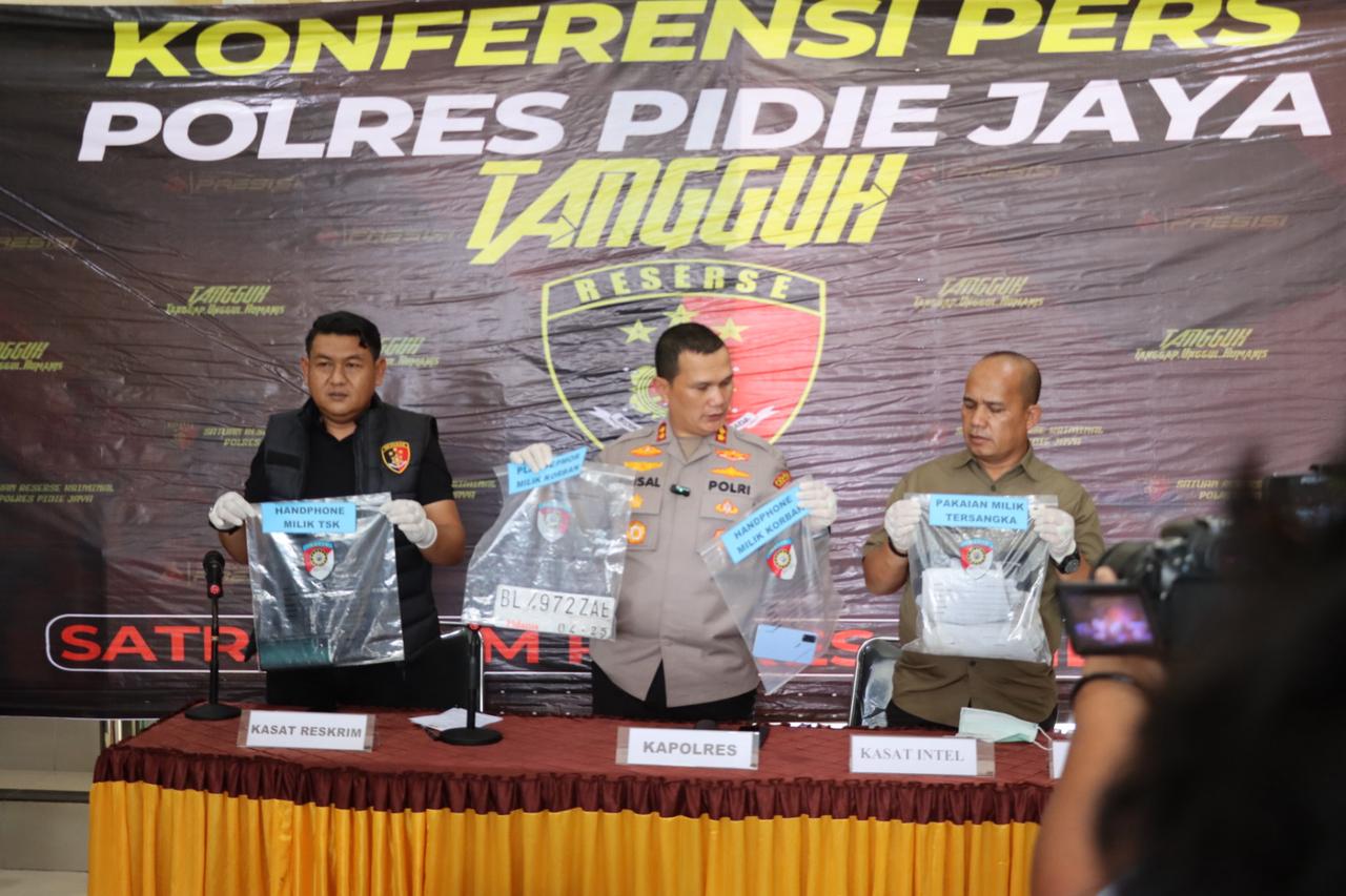 Kapolres Pidie Jaya, AKBP Ahmad Faisal Pasaribu, menyampaikan perkembangan kasus ini dalam konferensi pers di Loby Mapolres, Kamis, (17/4/2025).