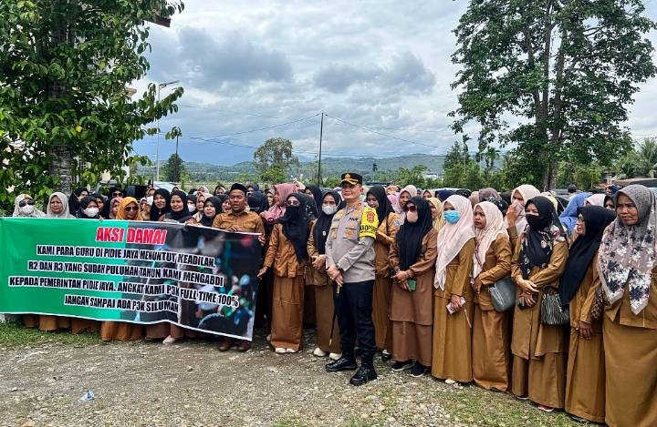 , Meureudu – Ratusan tenaga honorer guru menggelar aksi demonstrasi di depan Gedung DPRK Pidie Jaya menyampaikan aspirasi mereka, Senin, (13/01/2025). Dalam aksi itu, mereka meminta Pemkab Pidie Jaya untuk mengangkat guru honorer yang telah lama mengabdi sebagai Pegawai Pemerintah dengan Perjanjian Kerja (PPPK) penuh waktu.