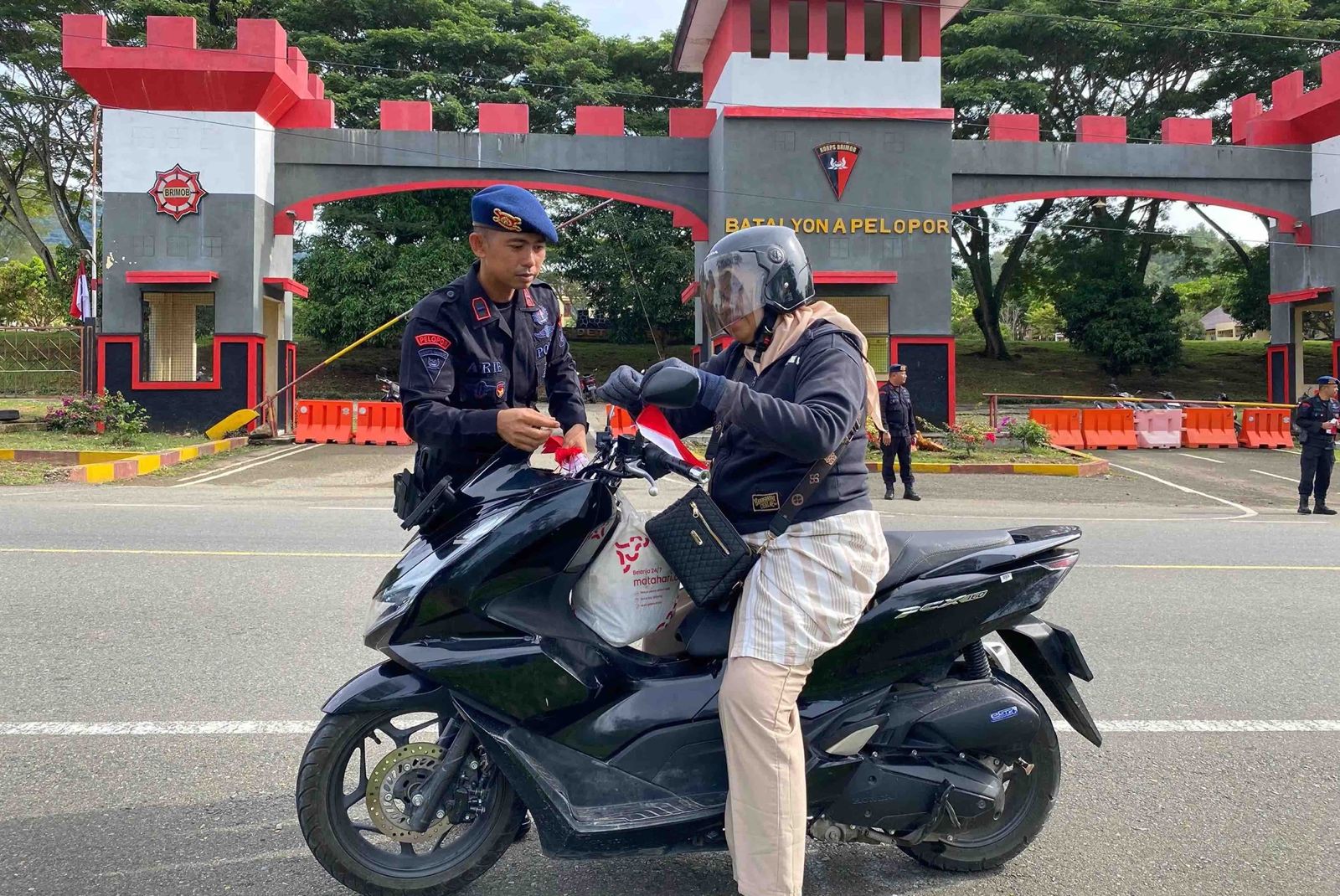 Sebanyak 100 bendera merah putih ukuran kecil dibagikan langsung oleh personel Brimob kepada pengendara sepeda motor dan mobil. Tak hanya sekadar membagikan, anggota Brimob juga membantu memasangkan bendera di kendaraan sambil menyapa warga dengan ramah.