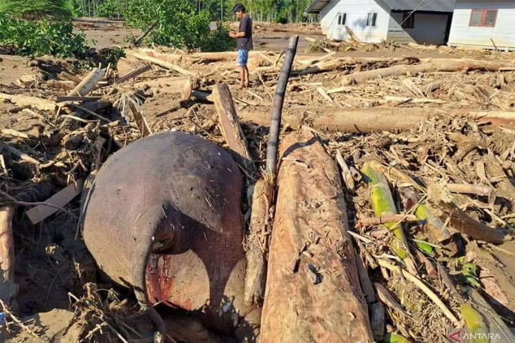 , Pidie Jaya — Seekor gajah sumatera (Elephas maximus sumatranus) ditemukan mati terjepit tumpukan kayu setelah terseret banjir bandang yang melanda Gampong Meunasah Lhok, Kecamatan Meureudu, Pidie Jaya, Sabtu (29/11/2025).
