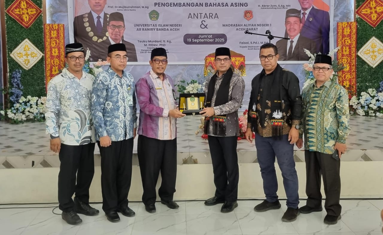 , Meulaboh — Universitas Islam Negeri (UIN) Ar-Raniry Banda Aceh melalui UPT Pusat Pengembangan Bahasa resmi menjalin kerja sama dengan MAN 1 Aceh Barat. Kolaborasi ini ditandai dengan penandatanganan Memorandum of Agreement (MoA) di Aula MAN 1 Aceh Barat, Jumat (19/9/2025).