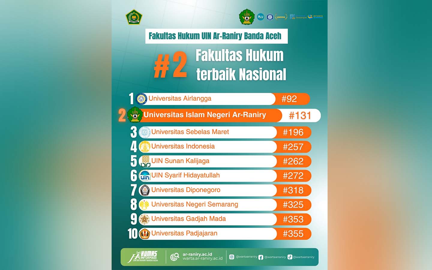 - UIN Ar-Raniry Banda Aceh menempati peringkat 2 nasional bidang hukum versi Scimago Institutions Rankings 2026.