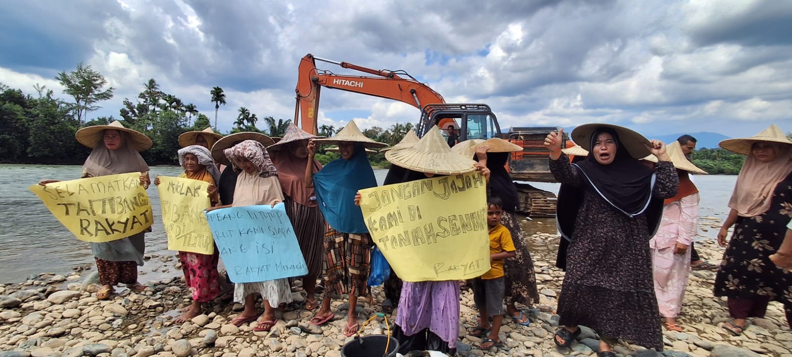 , Meulaboh – Warga dari sejumlah gampong di Kecamatan Pante Ceureumen, Aceh Barat melakukan aksi di pingir sungai Gampong Ketambang, Kamis (2/10/2025). Aksi yang didominasi kaum wanita ini menolak ditutupnya tambang menggunakan alat berat excavator.